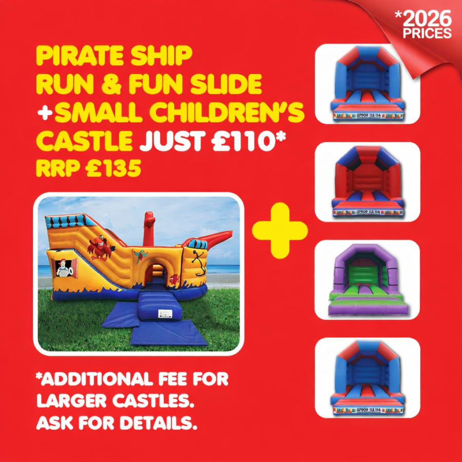 - Your Choice of Small Bouncy Castles: Complement the pirate ship with a choice of one of our bouncy castles. Whether you prefer a castle themed after a fairy tale, superhero, or any other theme, we have a variety of options to fit your party's theme and space requirements.